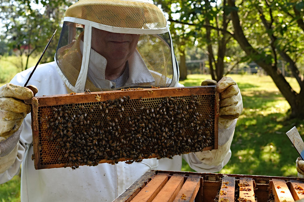 The honey harvest is still underway, with the Beekeepers reporting pretty good results so far. The bees will now work into the fall. Around October we will feed them sugar water, and then let them "bee" for the winter. At this time the bees will expel the drones from the hive, and the queen quits laying a good deal of eggs, so that the hive population is smaller over the winter. They will form a ball around the queen to keep her warm through the winter months.